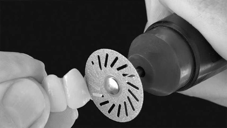 Flex TURBO med blå märkning=standardEn flexibel diamanttrissa med spiralutformade heltäckande diamanter på båda sidorna.Spiralutformningen underlättar slipningen av överflödigt material vid grovseparering och konturering av keramer, kompositer och akryl. Tjockleken 0,3 mm. Ø 080. Optimalt varvantal: 30.000 varv/min