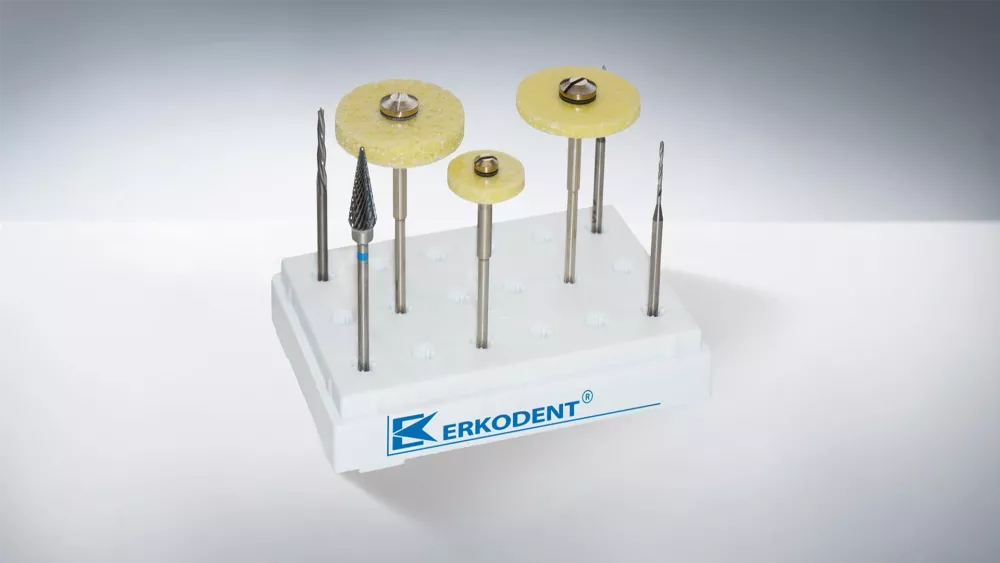 Poulärt set för att polera hårda formpressade skenor.Innehåller 60g specialpolermassa, 3 polerskivor förpackade i en Erkodent splintbox