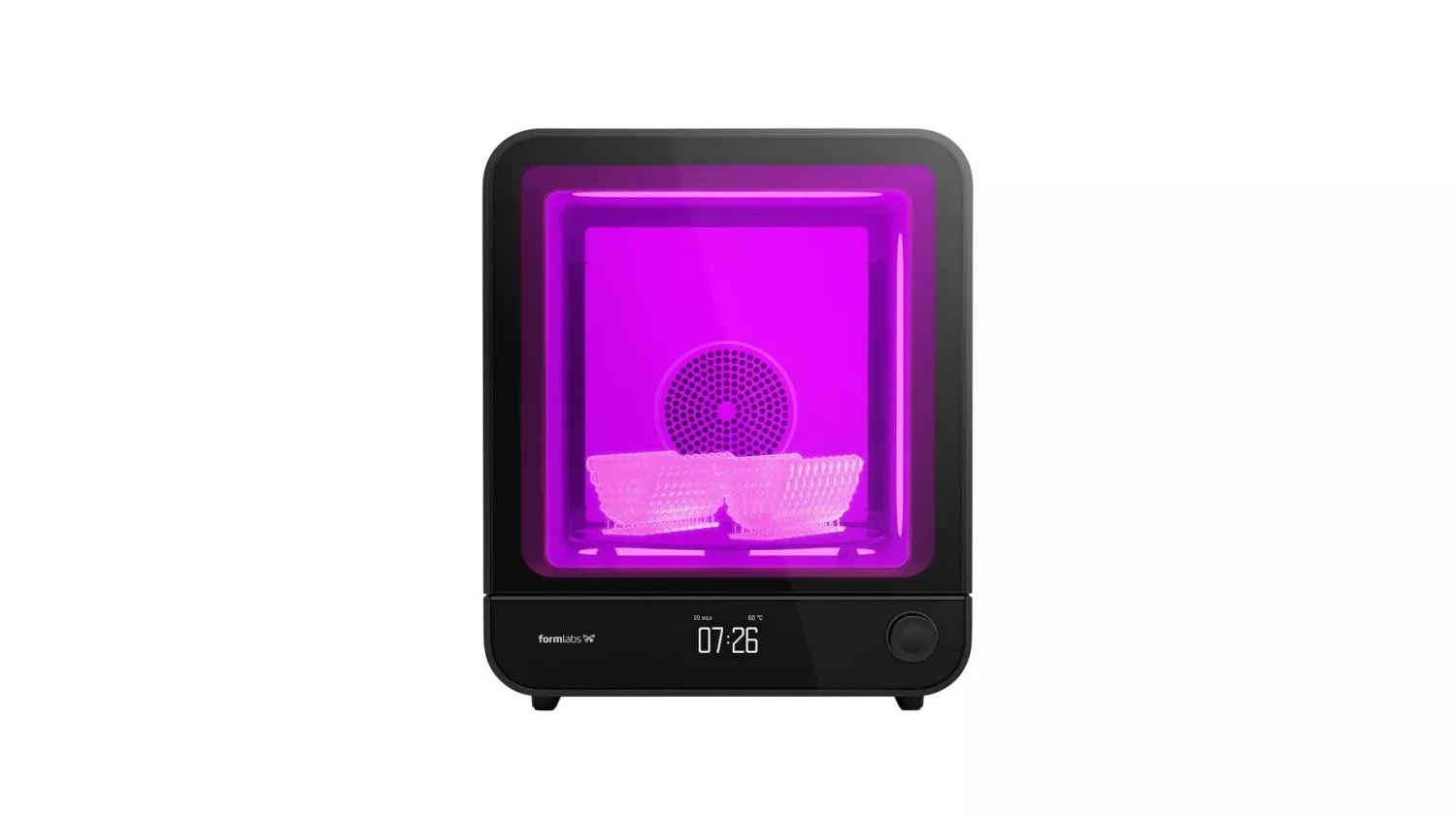 Smart tids & teperaturstyrning. Härdningen påverkas både av tid och temperatur, ställ in den önskade tiden och temperaturenså sköter Form Cure resten. Genom att använda 13st högeffektiva lysdioder med upp till 80 ° och 405 Nanometer, så håller Form Cure nere energiförbrukningen och eliminerar på samma gång behovet av lampbyten. En stor härdningskammare gör att du kan härda många modeller utan problem