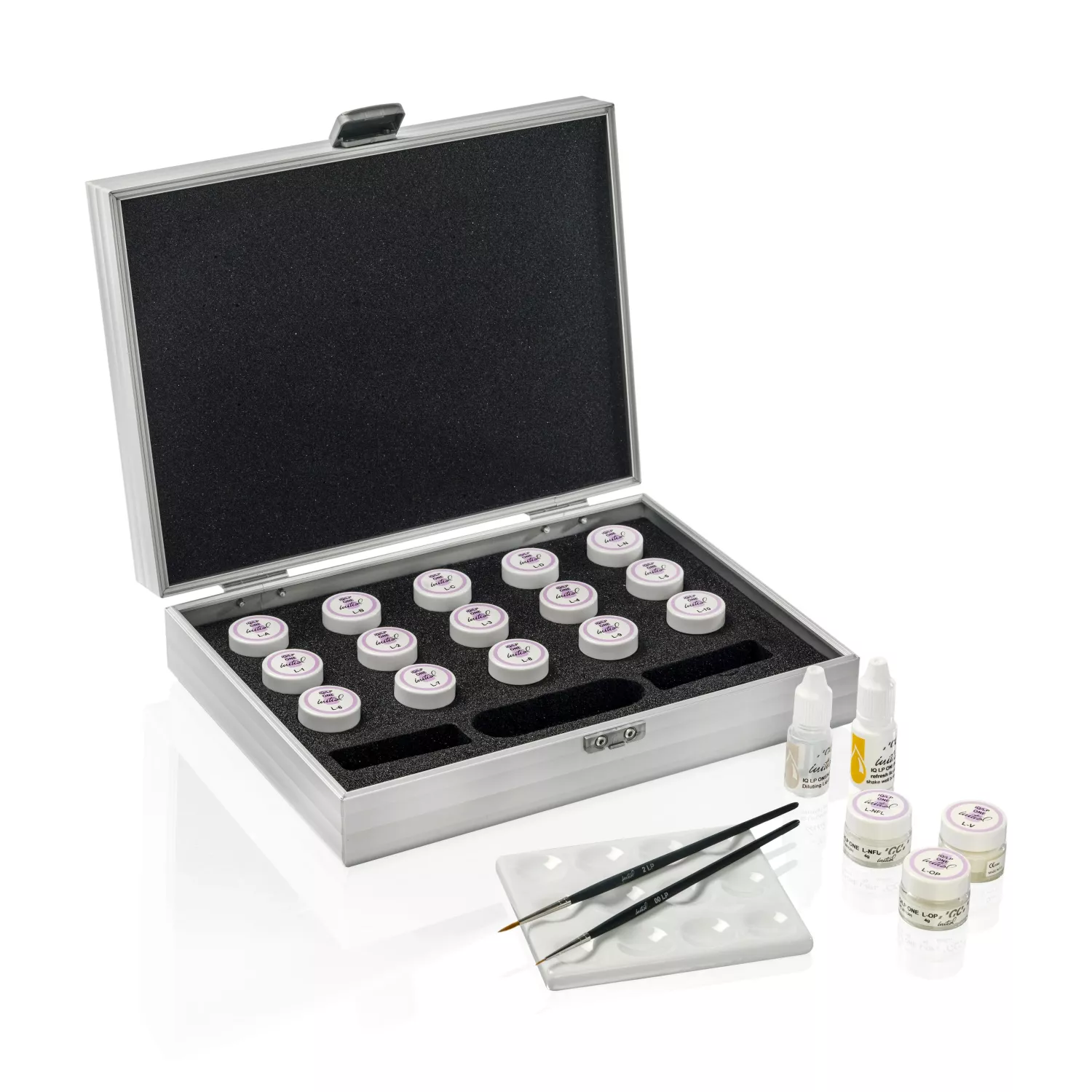 De kan appliceras i ett tjockare lager, vilket garanterar oöverträffad vitalitet och en mycket naturlig glaze. Fungerar utmärkt ihop med SQIN då den också ger en brännförbindelse. Lustre Pastes ONE är speciellt utvecklade för att ge dina monolitiska restaurationer ett naturligt fluorescerande utseende. Fluorescensen kan förstärkas med Lustre Neutral FLUO (L-NFL). Kit innehåller: 1 Neutral (L-N) 4 g; 1 Neutral Fluo (L-NFL) 4 g; 4 Body Shade (L-A, L-B, L-C, L-D) à 4 g; 10 Enamel Effect Shade (L-1, L-2, L-3, L-4, L-5, L-6, L-7, L-8, L-9, L-10) à 4 g; 1 Enamel Effect Shade Opal (L-OP) 4 g; 1 Enamel Effect Shade Value (L-V) 4 g; 1 Diluting Liquid 8 ml; 1 Refresh Liquid 8 ml; 1 mixing plate; 1 plastic cover; 2 brushes (No. 00, No. 2); 1 shade guide; technical manual.