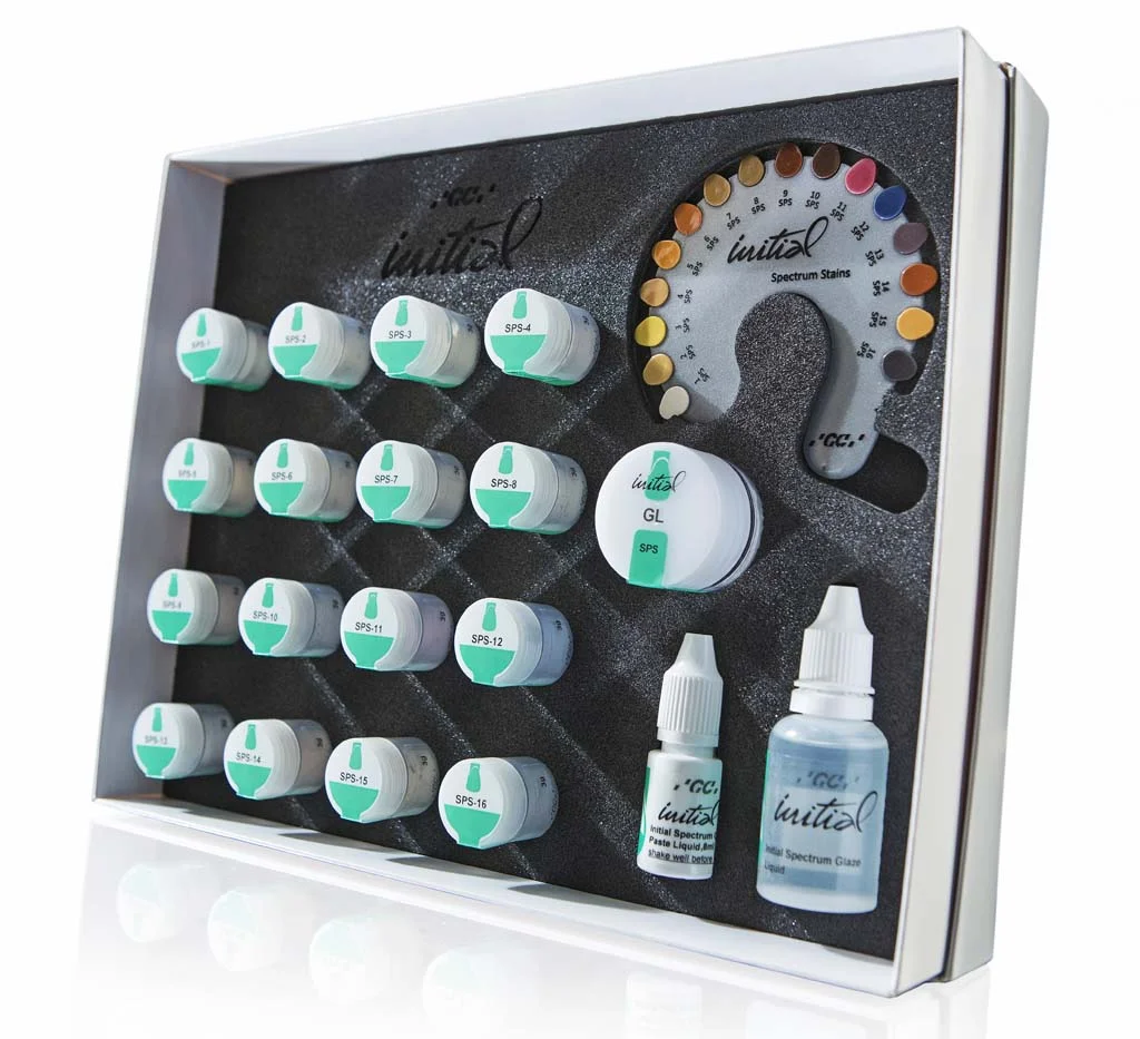 Spectrum Stains Set: 16 Stains (SPS-1 to SPS-16) à 3 g; 1 Glaze Powder (GL) 10 g; 1 Glaze Liquid 25 ml; 1 Glaze Paste Liquid 8 ml; 1 shade guide. Denthouse AB är stolta auktoriserde återförsäljare för GC i Norden.