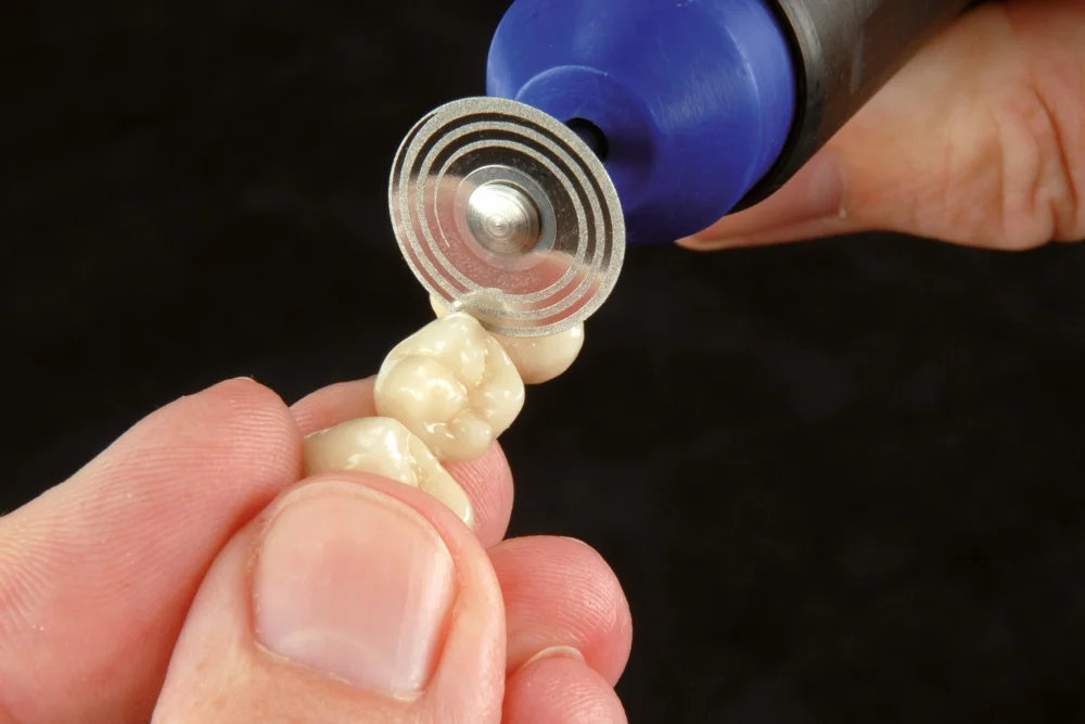 Superflex med gul märkning=superfin. En flexibel diamanttrissa med spiralutformade diamanter heltäckande på båda sidorna. Mönstret underlättar slipningen av överflödigt material. För finseparering och konturering av keramer, kompositer och akryl.Tjockleken 0,12 mm. Ø 22. Optimalt varvantal: 25.000 varv/min