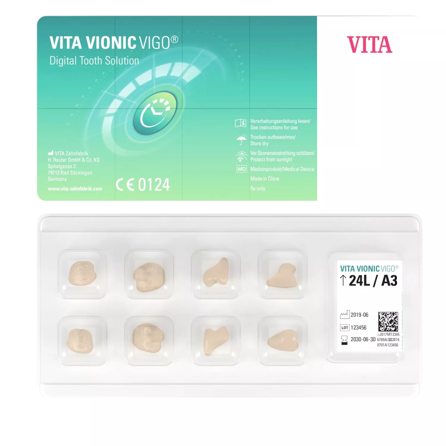 Vad? VITA VIONIC VIGO är en helt ny generation protes tänder gjorda av SE -polymer med en design perfekt för digital tillverkning av proteser. Varför då? Denna nya generation tänder kan fixeras exakt och pålitligt i protesbasen utan slipning på tänderna, vilket resulterar i ett effektiv färdigställande Med vad? VITA VIONIC SOLUTIONS-portföljen innehåller: Åtta övre främre tandformer, fyra nedre främre tandformer, fyra övre och nedre bakre tandformer vardera, ett bondingssystem och diskar för vaxinprovningar och protesbasar.